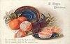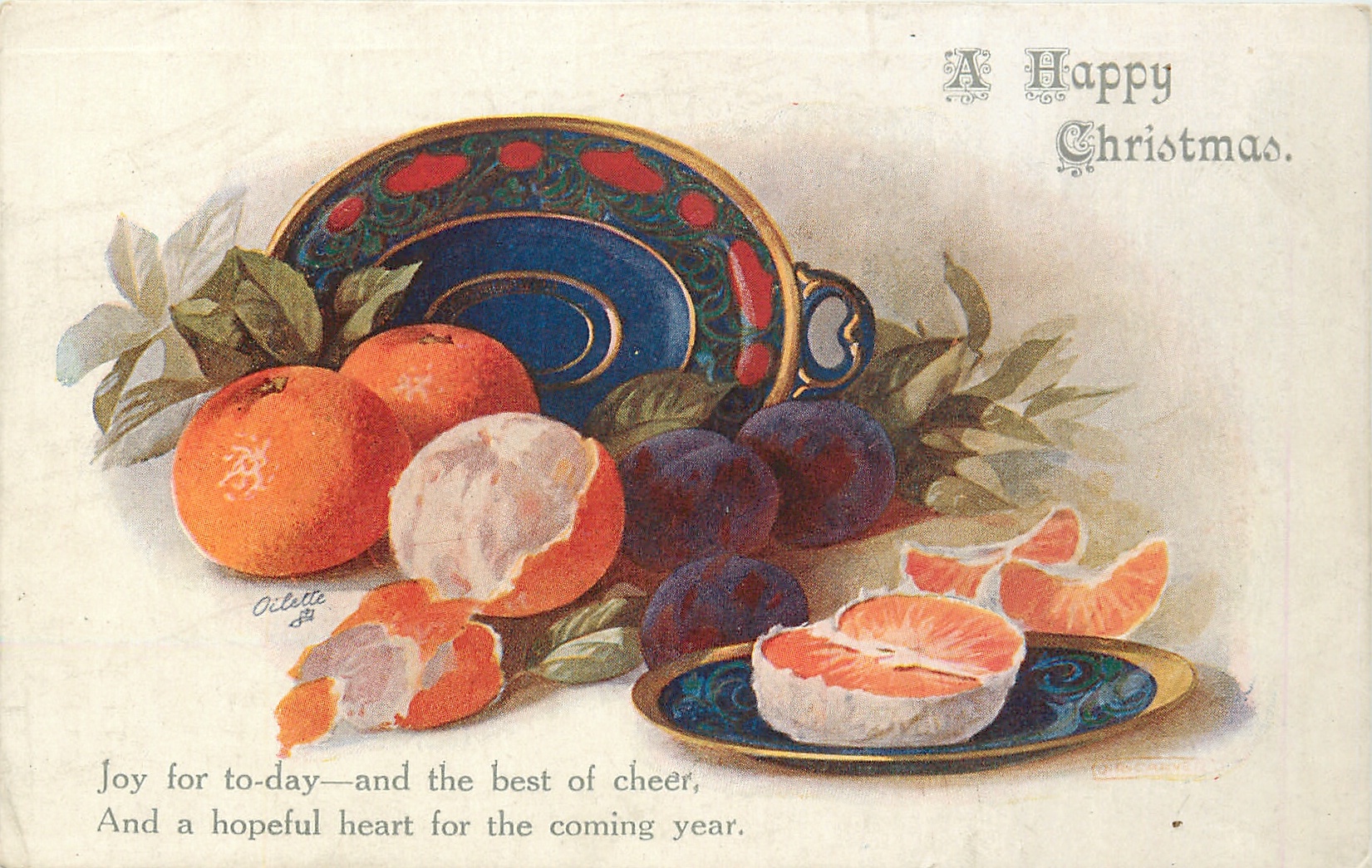 A HAPPY CHRISTMAS plates with four oranges, one peeled & three plums
