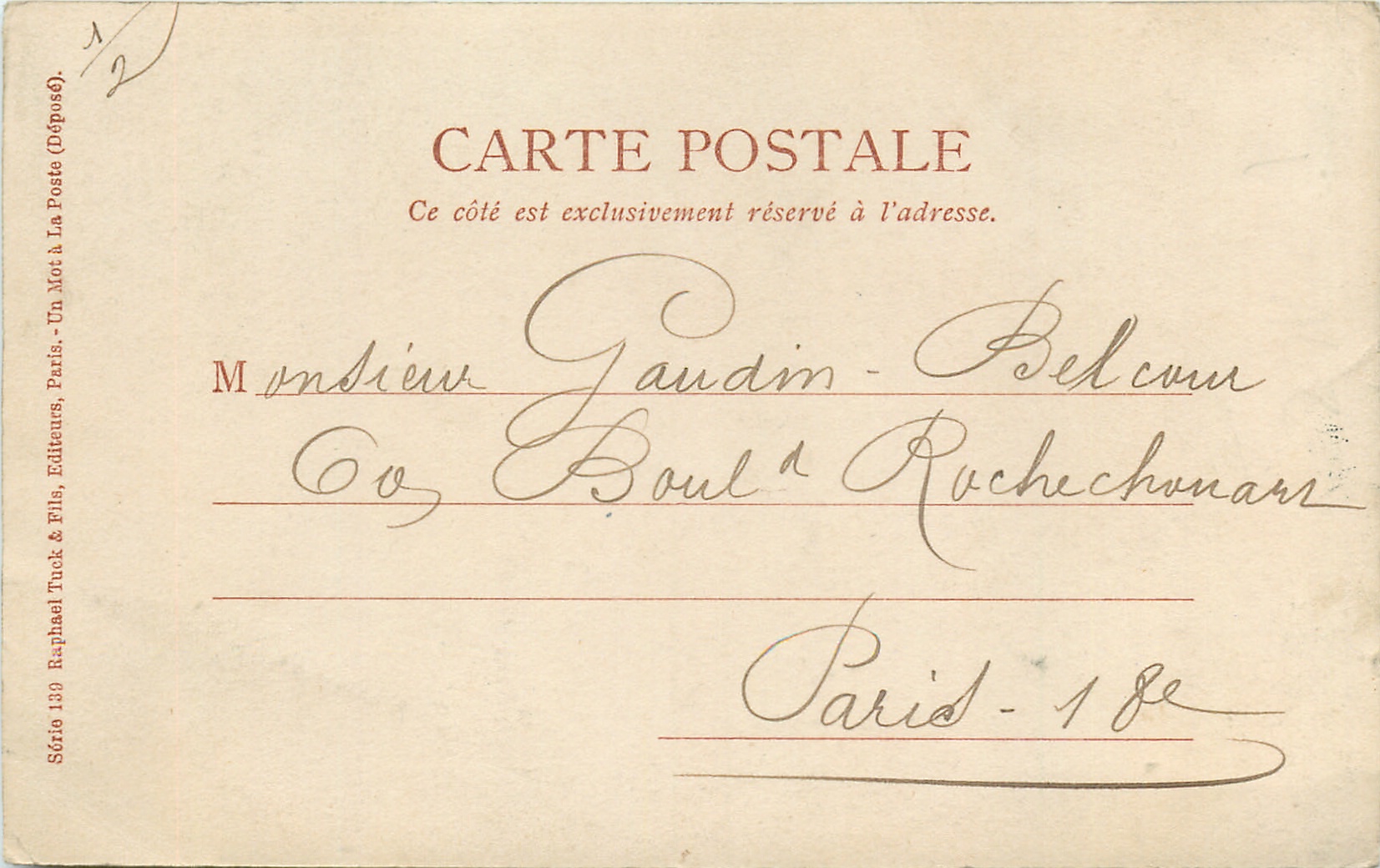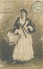 woman faces front and looks left, she holds large rectangular basket in right hand