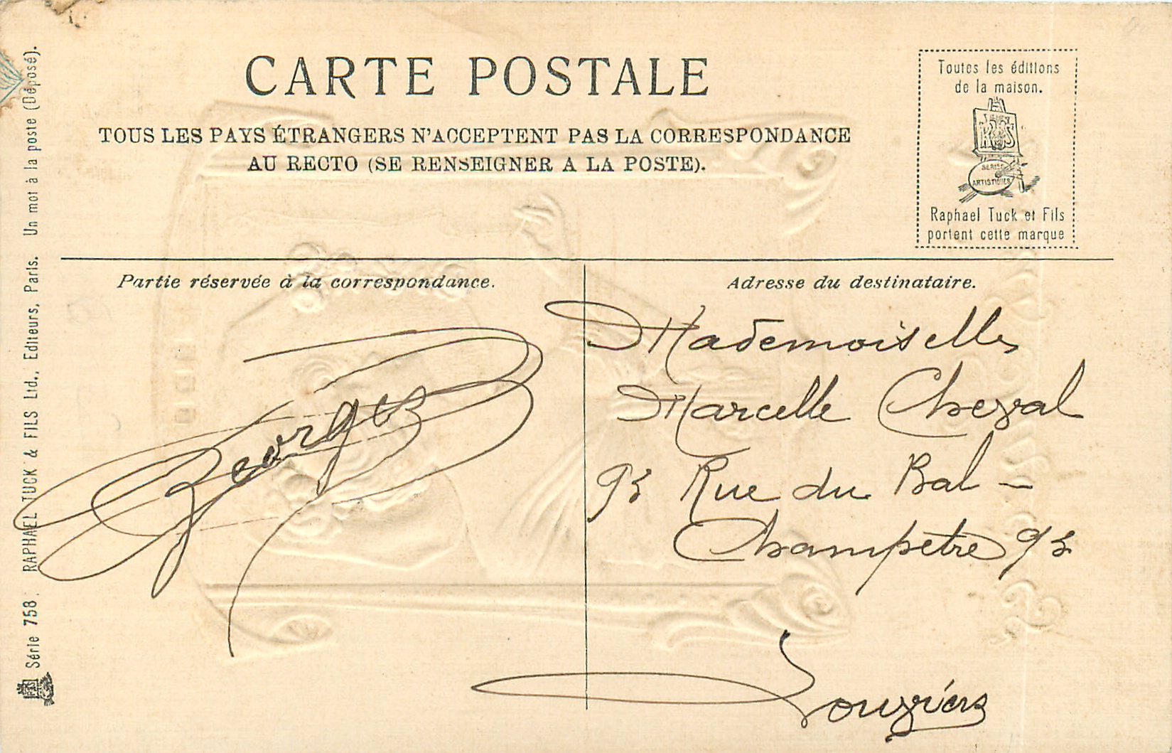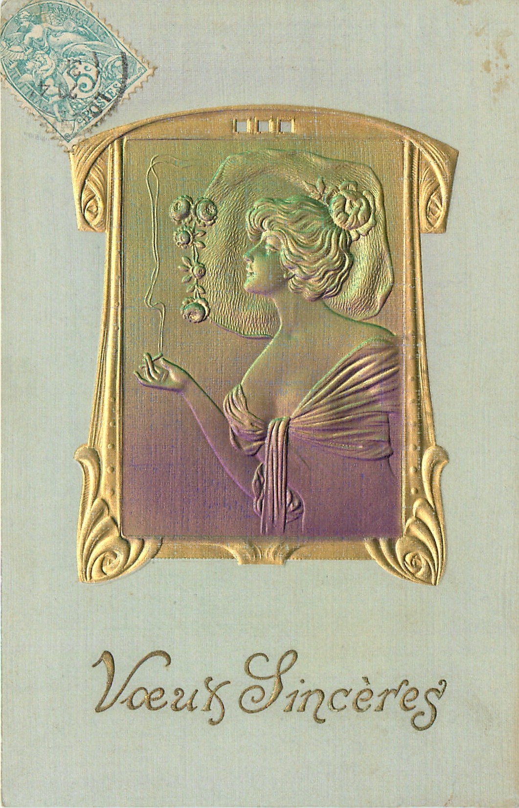 UN MOT A LA POST (DEPOSE) gilt embossed panels with Art Nouveau borders above gilt seasonal greetings