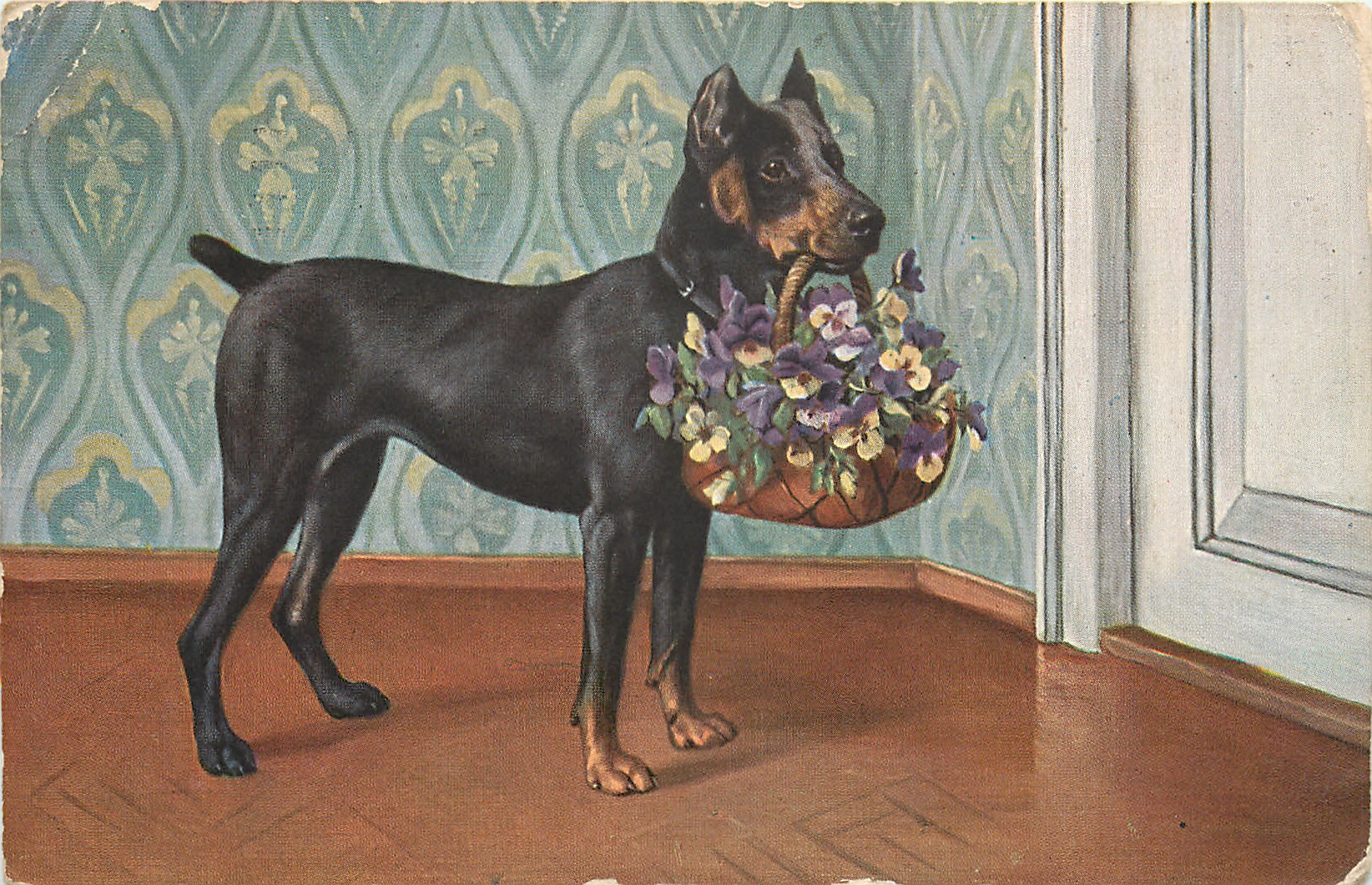large black dog facing right holding a basket of flowers