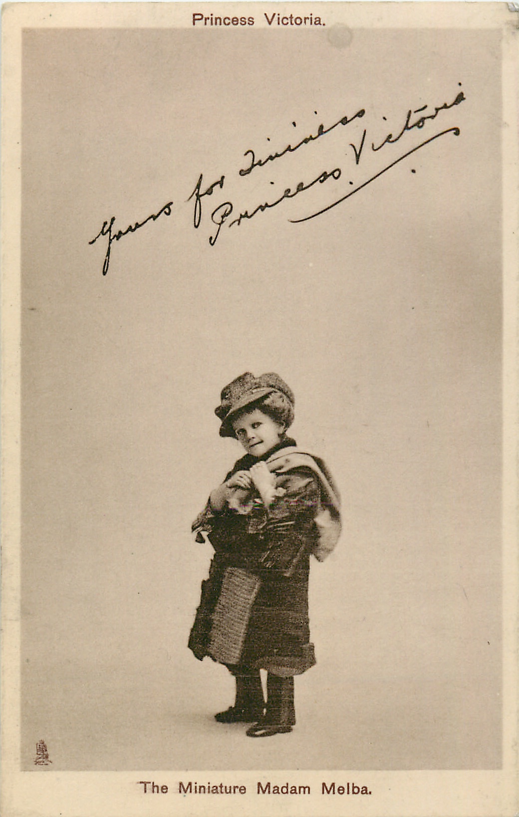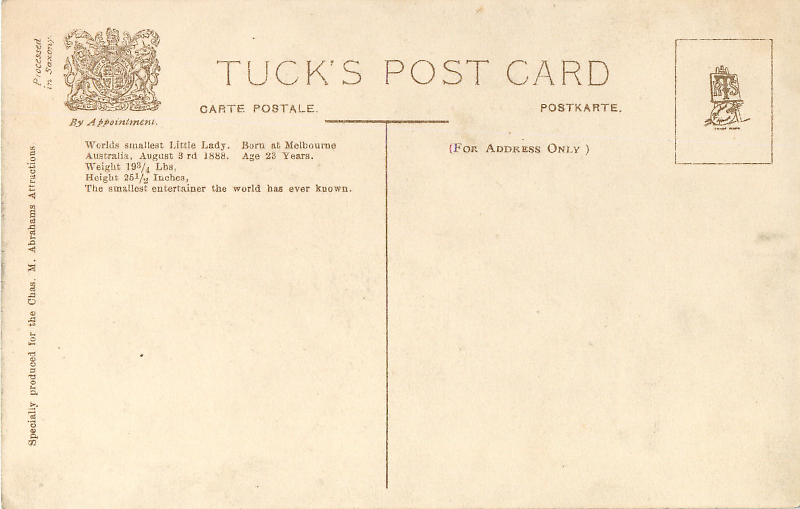 SPECIALLY PRODUCED FOR THE CHARLES M. ABRAHAMS ATTRACTIONS. PROCESSED IN SAXONY. back information:- WORLD'S SMALLEST LITTLE LADY. BORN AT MELBOURNE AUSTRALIA, AUGUST 3RD 1888.AGE 23 YEARS. WEIGHT 19 3/4 LBS. HEIGHT 251/2 INCHES THE SMALLEST ENTERTAINER THE WORLD HAS EVER KNOWN facsimile YOURS FOR TININESS PRINCESS VICTORIA