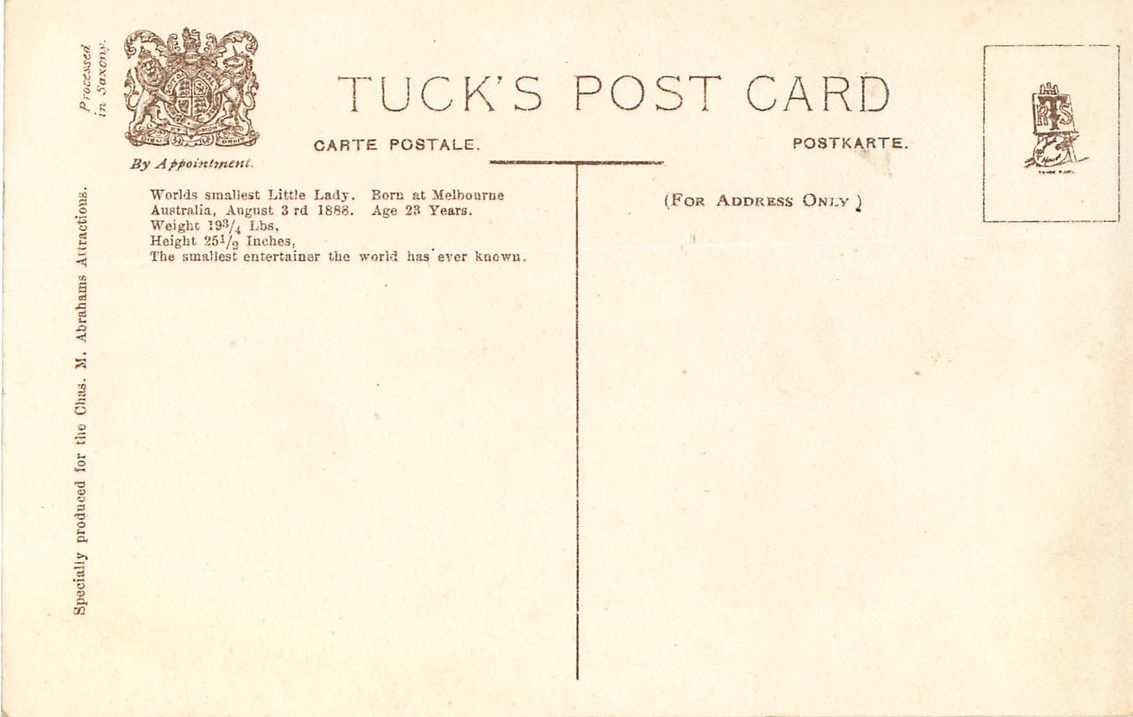 SPECIALLY PRODUCED FOR THE CHARLES M. ABRAHAMS ATTRACTIONS. PROCESSED IN SAXONY. back information:- WORLD'S SMALLEST LITTLE LADY. BORN AT MELBOURNE AUSTRALIA, AUGUST 3RD 1888.AGE 23 YEARS. WEIGHT 19 3/4 LBS. HEIGHT 251/2 INCHES THE SMALLEST ENTERTAINER THE WORLD HAS EVER KNOWN facsimile YOURS FOR TININESS PRINCESS VICTORIA