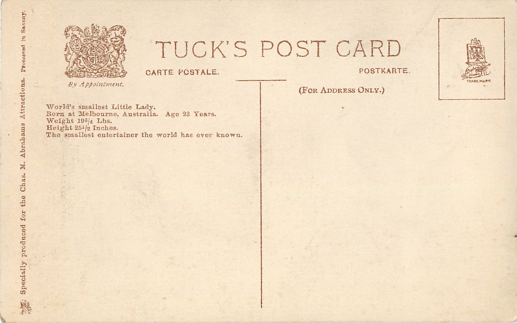SPECIALLY PRODUCED FOR THE CHARLES M. ABRAHAMS ATTRACTIONS. PROCESSED IN SAXONY. back information:- WORLD'S SMALLEST LITTLE LADY. BORN AT MELBOURNE AUSTRALIA, AUGUST 3RD 1888.AGE 23 YEARS. WEIGHT 19 3/4 LBS. HEIGHT 251/2 INCHES THE SMALLEST ENTERTAINER THE WORLD HAS EVER KNOWN
