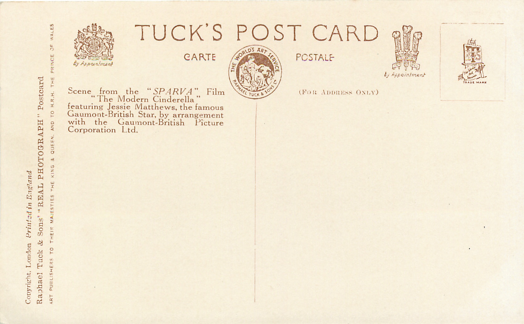 REAL PHOTOGRAPH, COPYRIGHT LONDON, PRINTED IN ENGLAND, SCENES FROM THE "SPARVA" FILM "THE MODERN CINDERELLA" FEATURING JESSE MATTHEWS THE FAMOUS GAUMONT-BRITISH STAR. BY ARRANGEMANT WITH THE GAUMONT-BRITISH PICTURE CORPORATION LTD.