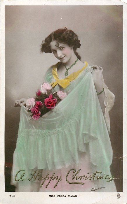 PHOTO JOHNSTON & HOFFMANN, hand-coloured,come opt. A HAPPY CHRISTMAS Freda Vivian was Mychellah in " The Cingalee" Musical Play Daly's Th .London 1905 (365)