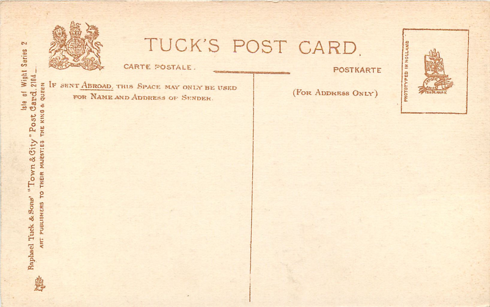 grey/black, TOWN & CITY, PHOTOTYPED IN HOLLAND (in stamp box), same images as ISLE OF WIGHT TOWN AND CITY SERIES 2, listed in RAPHAEL TUCK & SONS' LD. CHRISTMAS & NEW YEAR 1904/1905 catalogue