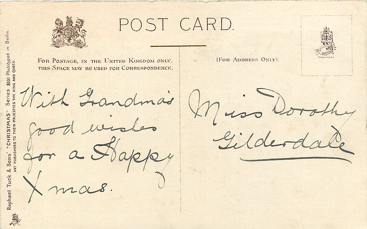 PHOTOTYPED IN BERLIN, shades of grey/black, come hand coloured but not so tradenamed, listed in RAPHAEL TUCK & SONS' LD. CHRISTMAS & NEW YEAR 1904/1905 catalogue