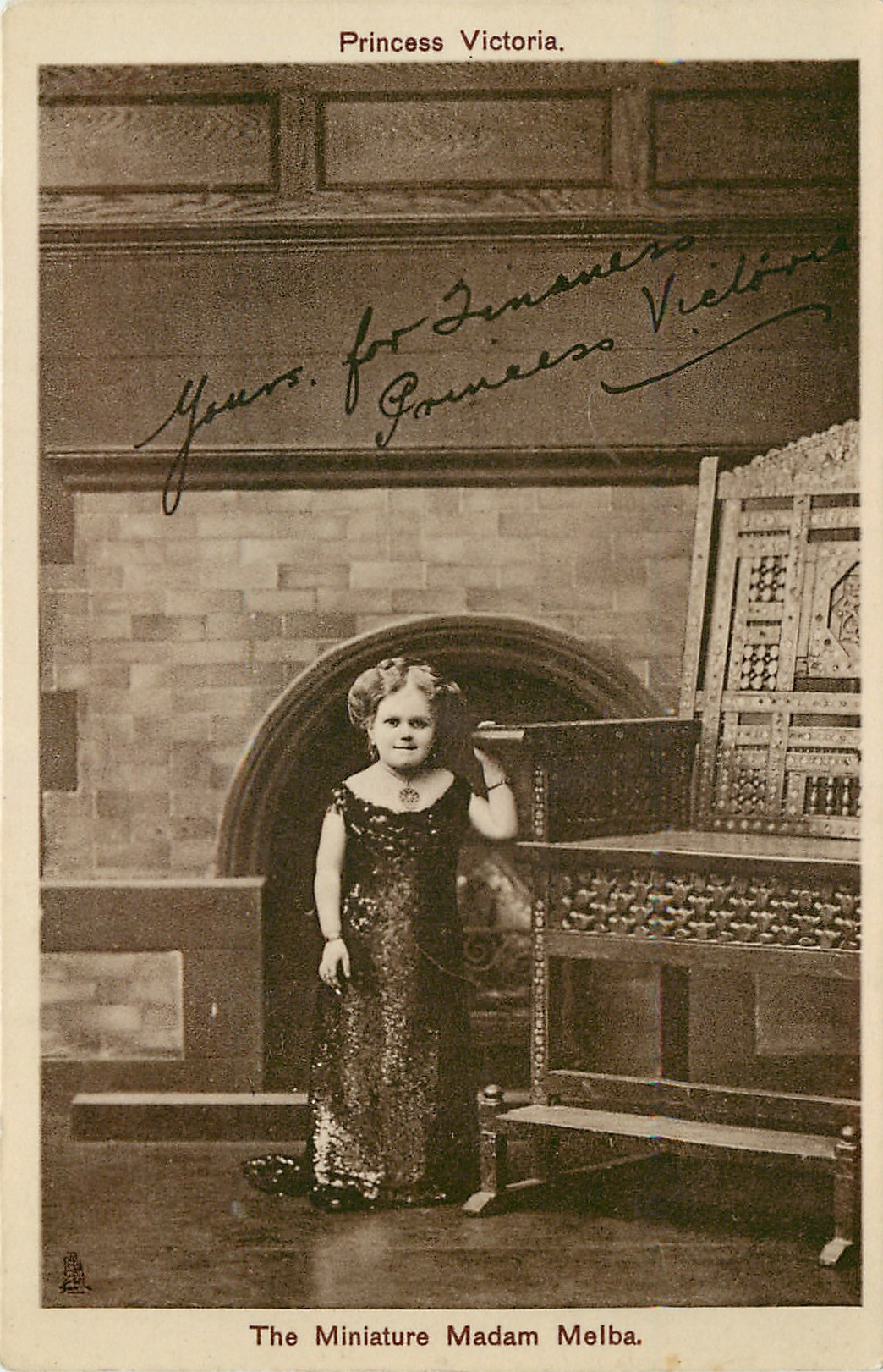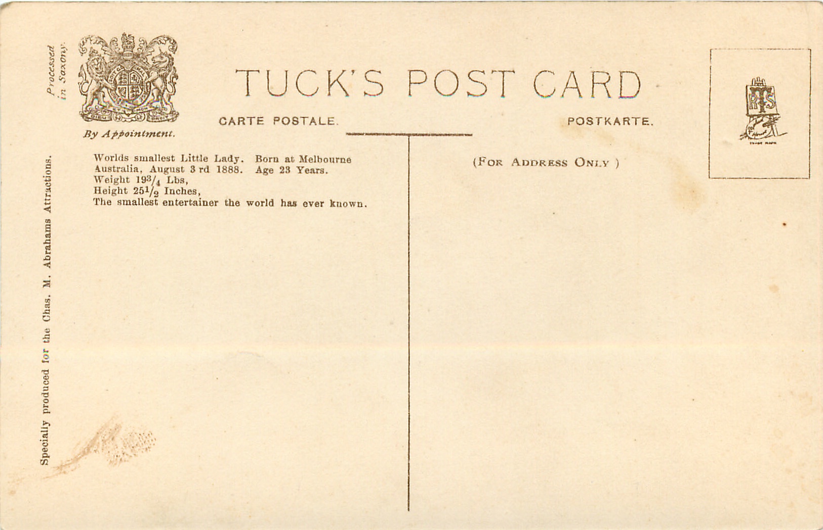 SPECIALLY PRODUCED FOR THE CHARLES M. ABRAHAMS ATTRACTIONS. PROCESSED IN SAXONY. back information:- WORLD'S SMALLEST LITTLE LADY. BORN AT MELBOURNE AUSTRALIA, AUGUST 3RD 1888.AGE 23 YEARS. WEIGHT 19 3/4 LBS. HEIGHT 251/2 INCHES THE SMALLEST ENTERTAINER THE WORLD HAS EVER KNOWN facsimile YOURS FOR TININESS PRINCESS VICTORIA