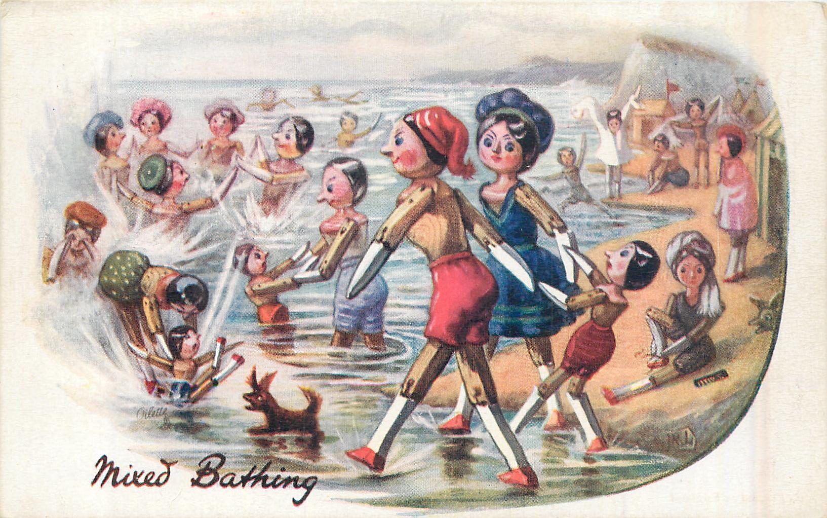 MIXED BATHING ocean scene with land on the right
