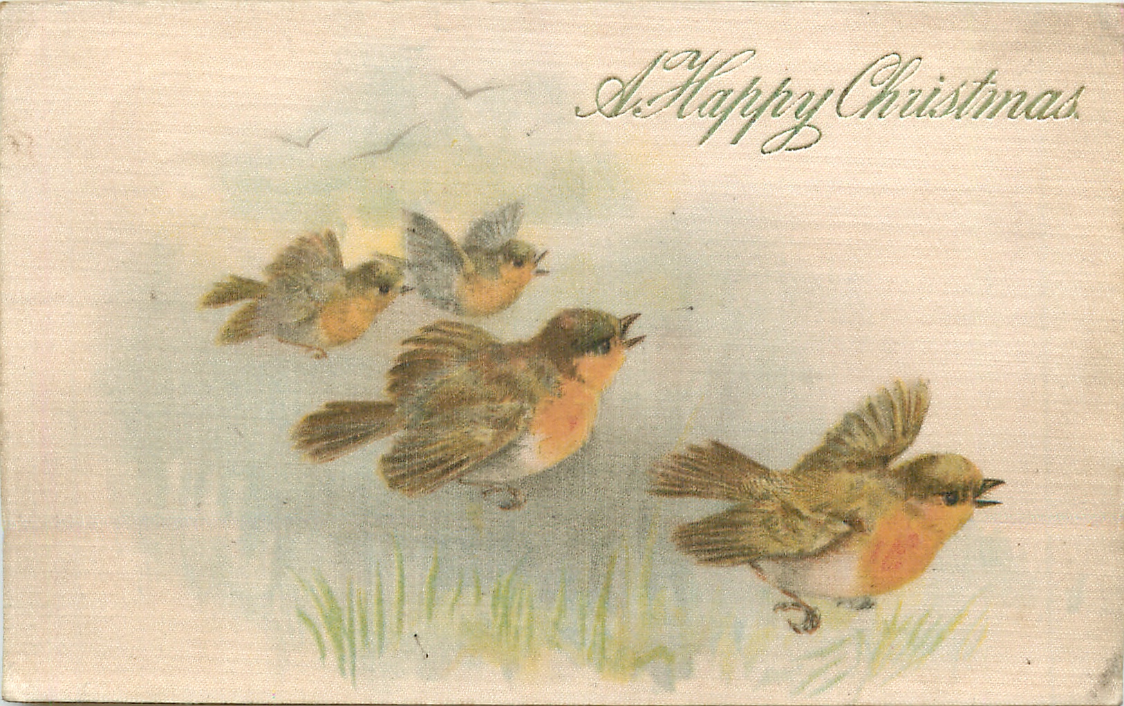 A HAPPY CHRISTMAS, four yellow breasted birds fly right