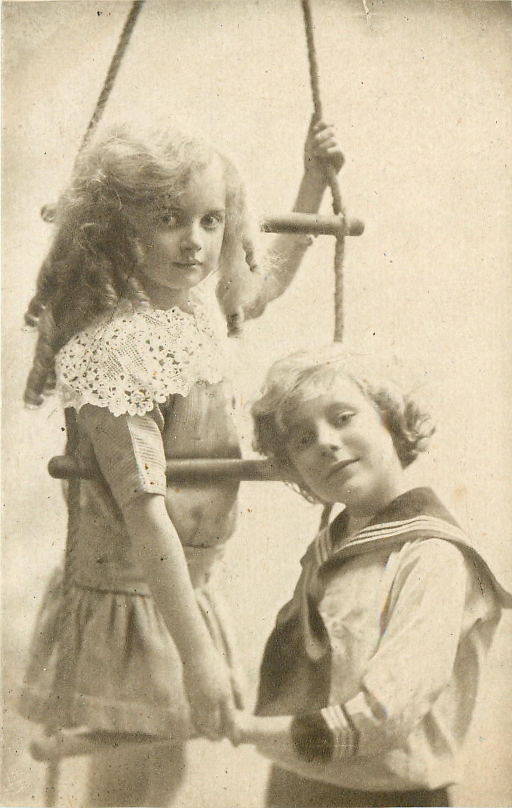 boy stands in front of rope ladder resting his head on the rung, girl behind holding his hand and holding rope, her head is between middle and upper rung