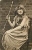 pretty woman sits on chair facing left, holds a broom with right hand, left hand rests on her knee