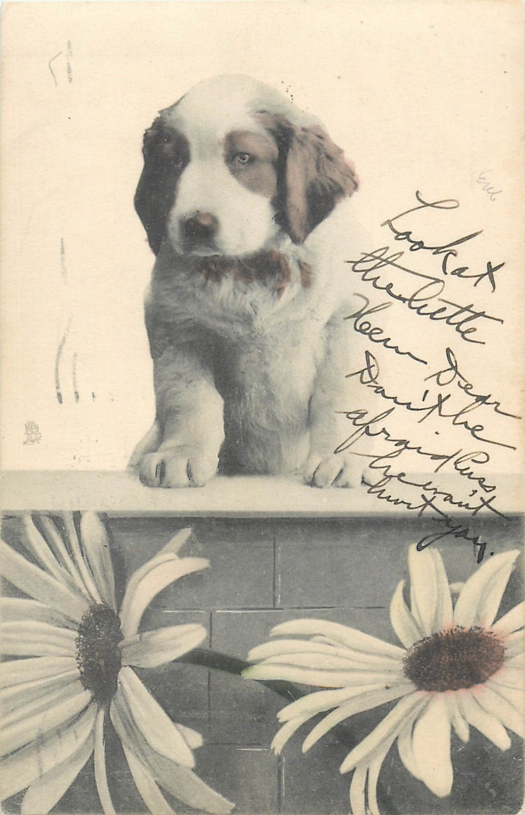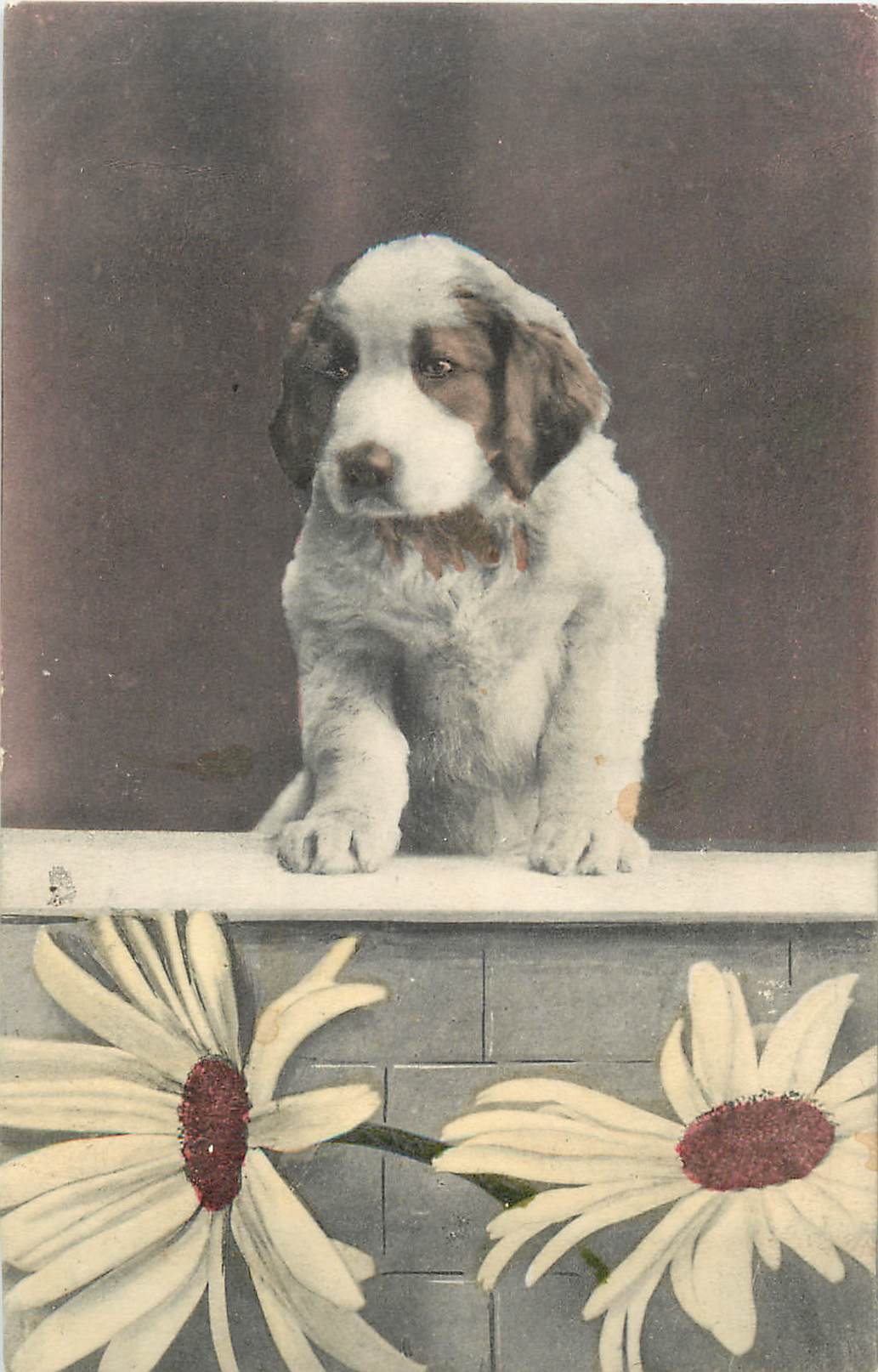 St. Bernard puppy sits on wall looking slightly left, two daisies below