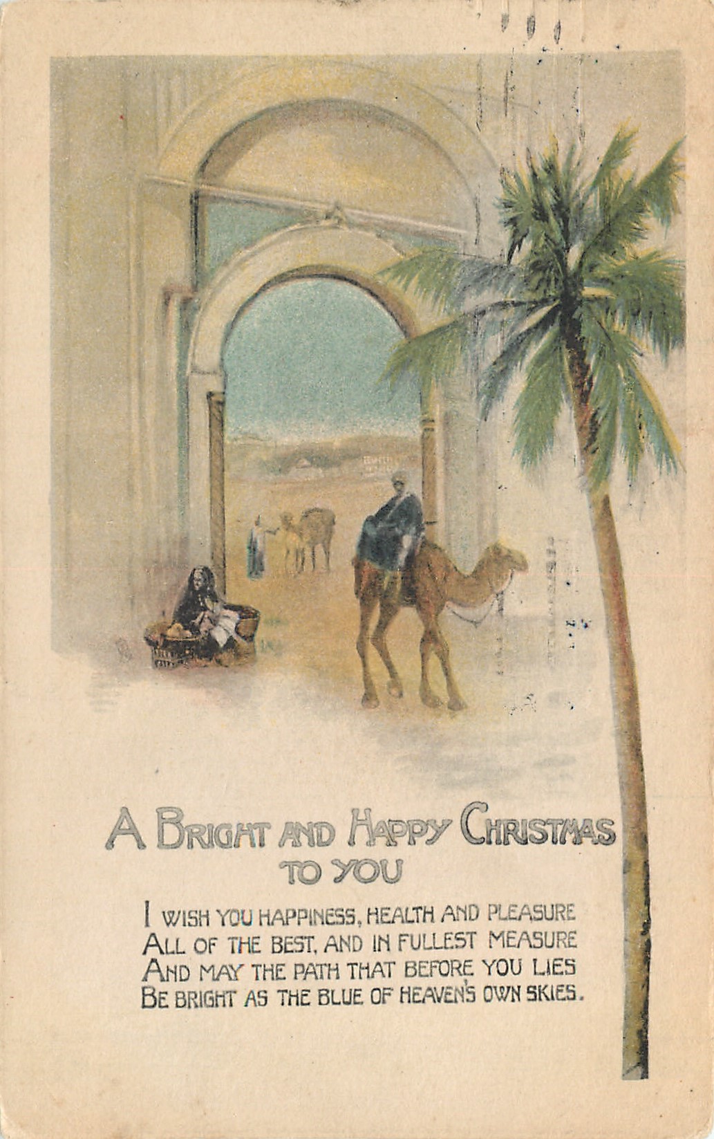 A BRIGHT AND HAPPY CHRISTMAS TO YOU camel scene & palm tree
