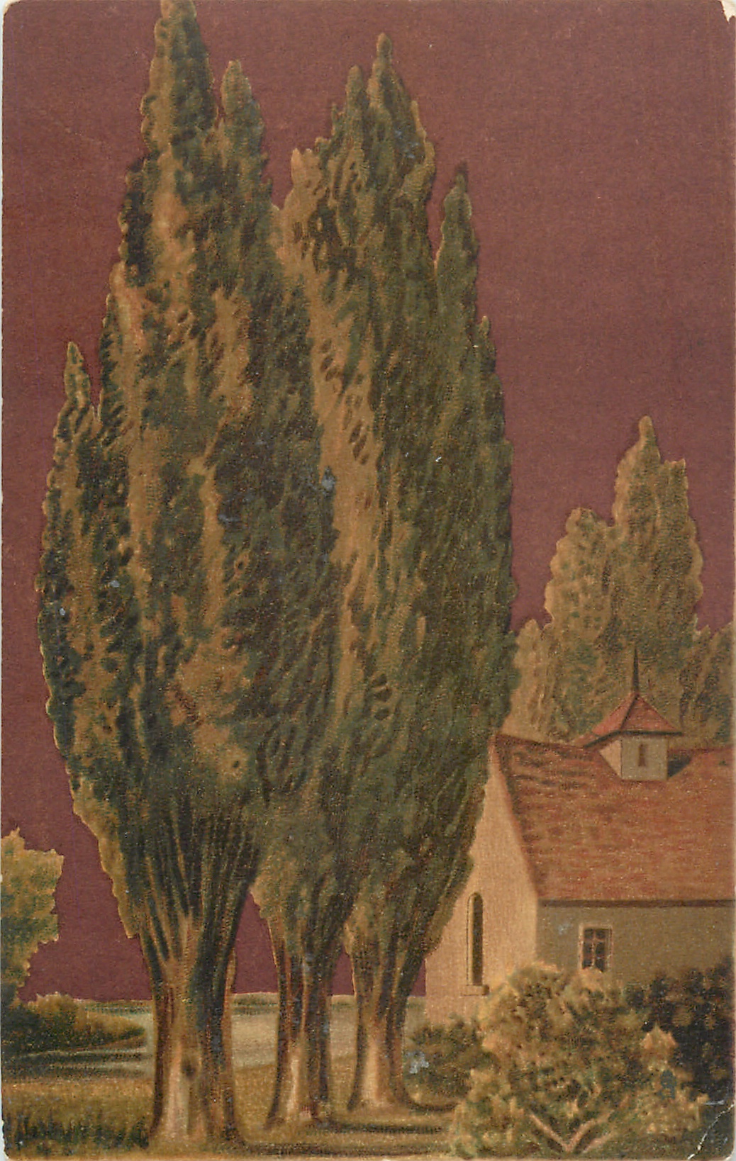 three big trees middle/left, house right