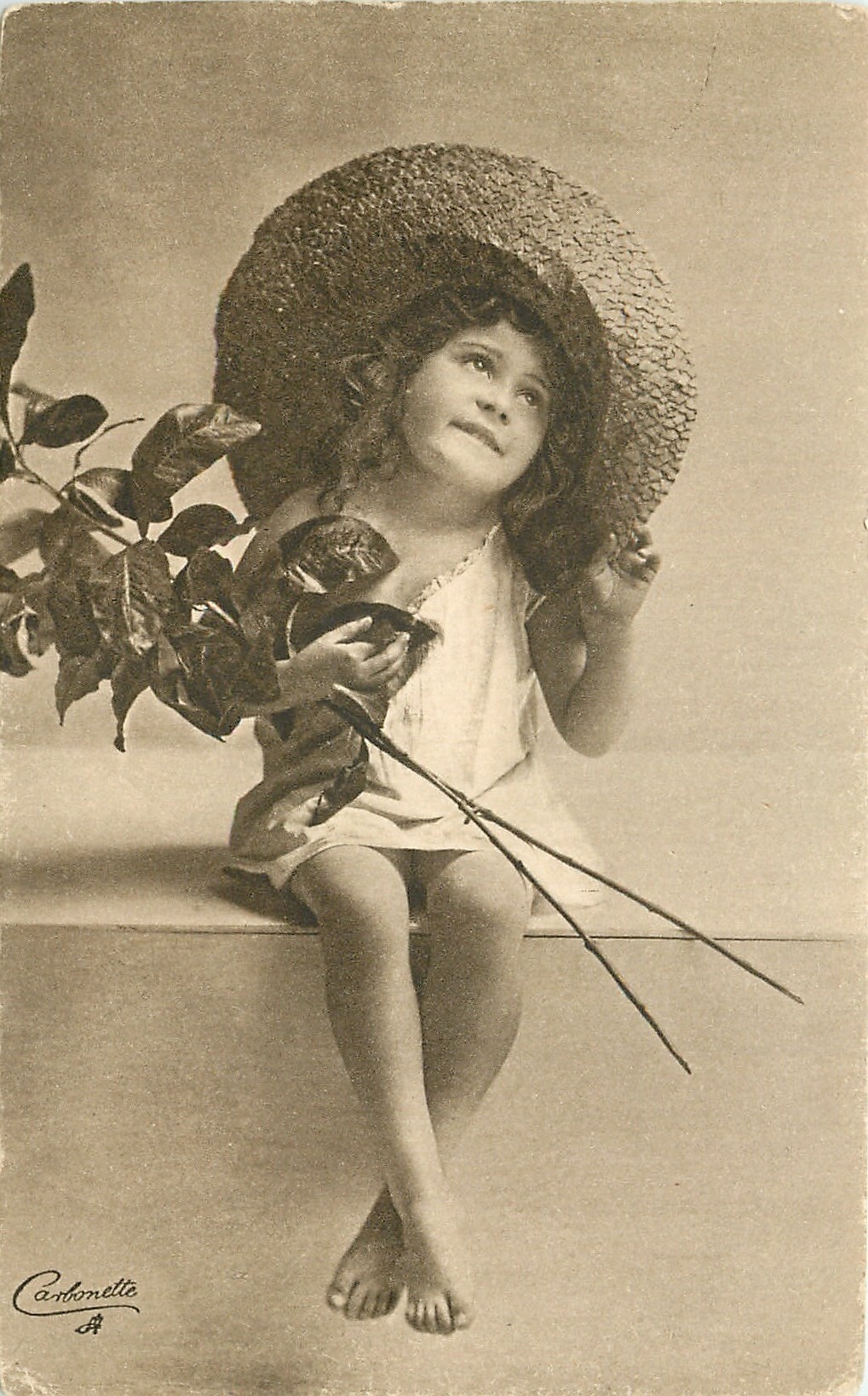 girl sitting down with large straw hat on, holding plant stems in each hand