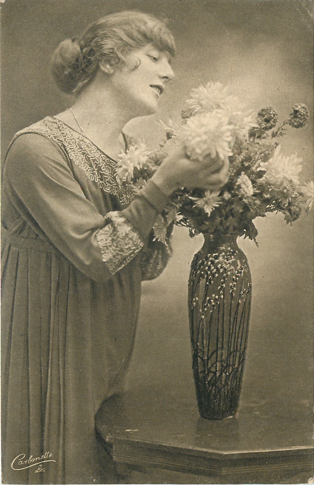 woman posed beside vase containing large bunch of flowers which she holds with both hands, looks down to right
