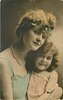 young lady with little girl, lady with short hair and band around head, pearls, little girl on right, lady holding girl with her left hand, both look forward