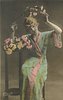 girl in robe sitting on stool holding branch of flowers with right hand and touching flowers in left hand, small table on the left