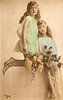 two girls in smocks, both on wall, girl to left kneels, girl right sits