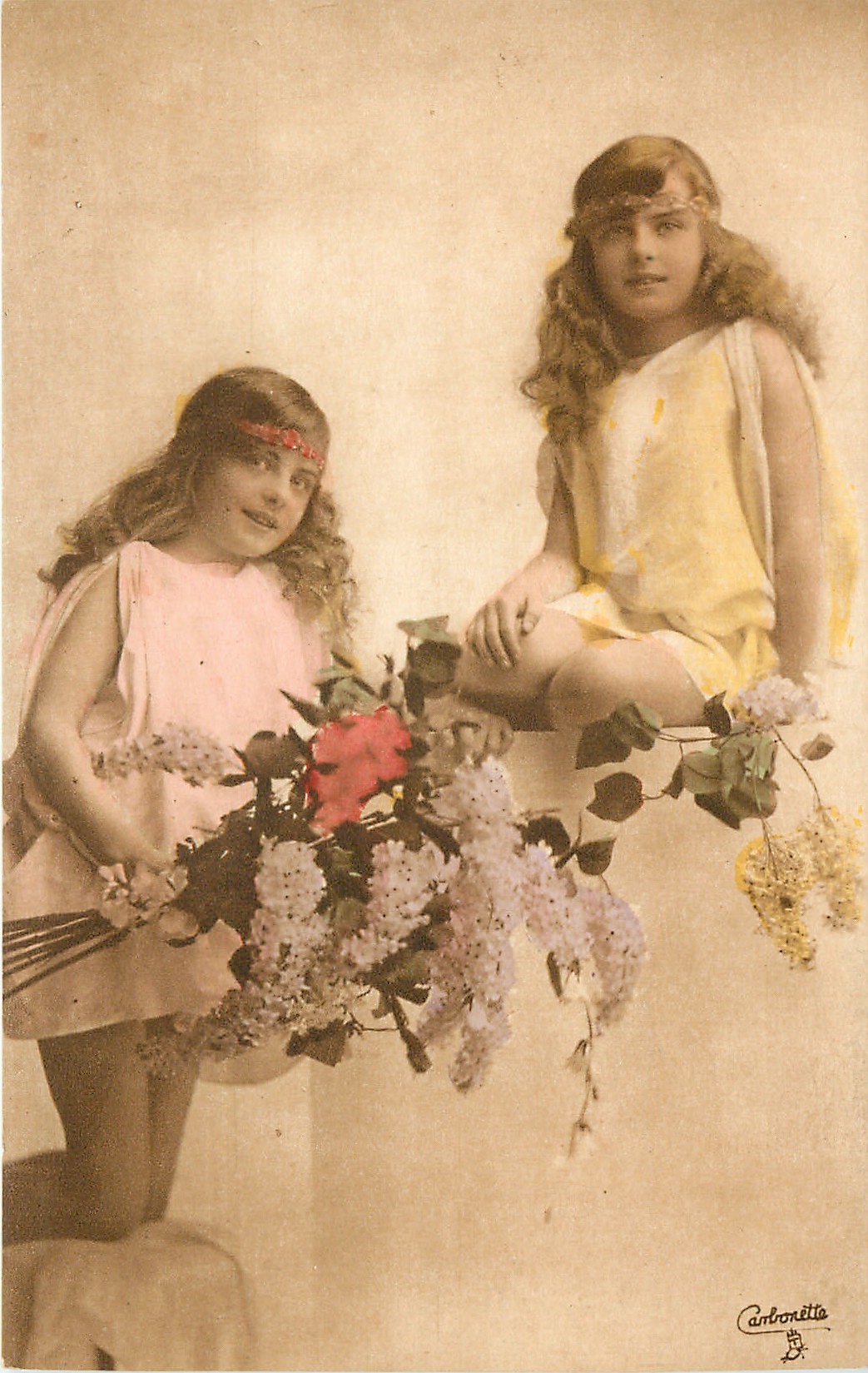 two girls in smocks, one sitting on wall, other kneeling to left with flowers