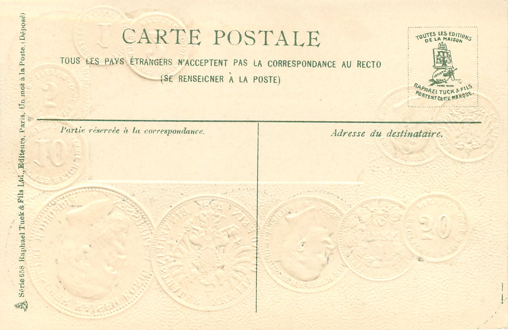 green backs, UN MOT A LA POSTE, (DEPOSE), gilt & silver embossed, come POUR FAIRE CONNAITRE LE MONEYAGE INTERNATIONAL, Zeiher type of coin card numbers upper right corner