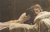 girl on bed, pillow right, girl's left hand on pillow, with right hand hugs small black dog