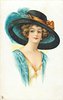 lady facing partly right in cream dress, blue throw, blue hat with yellow hat-band & blue feathers