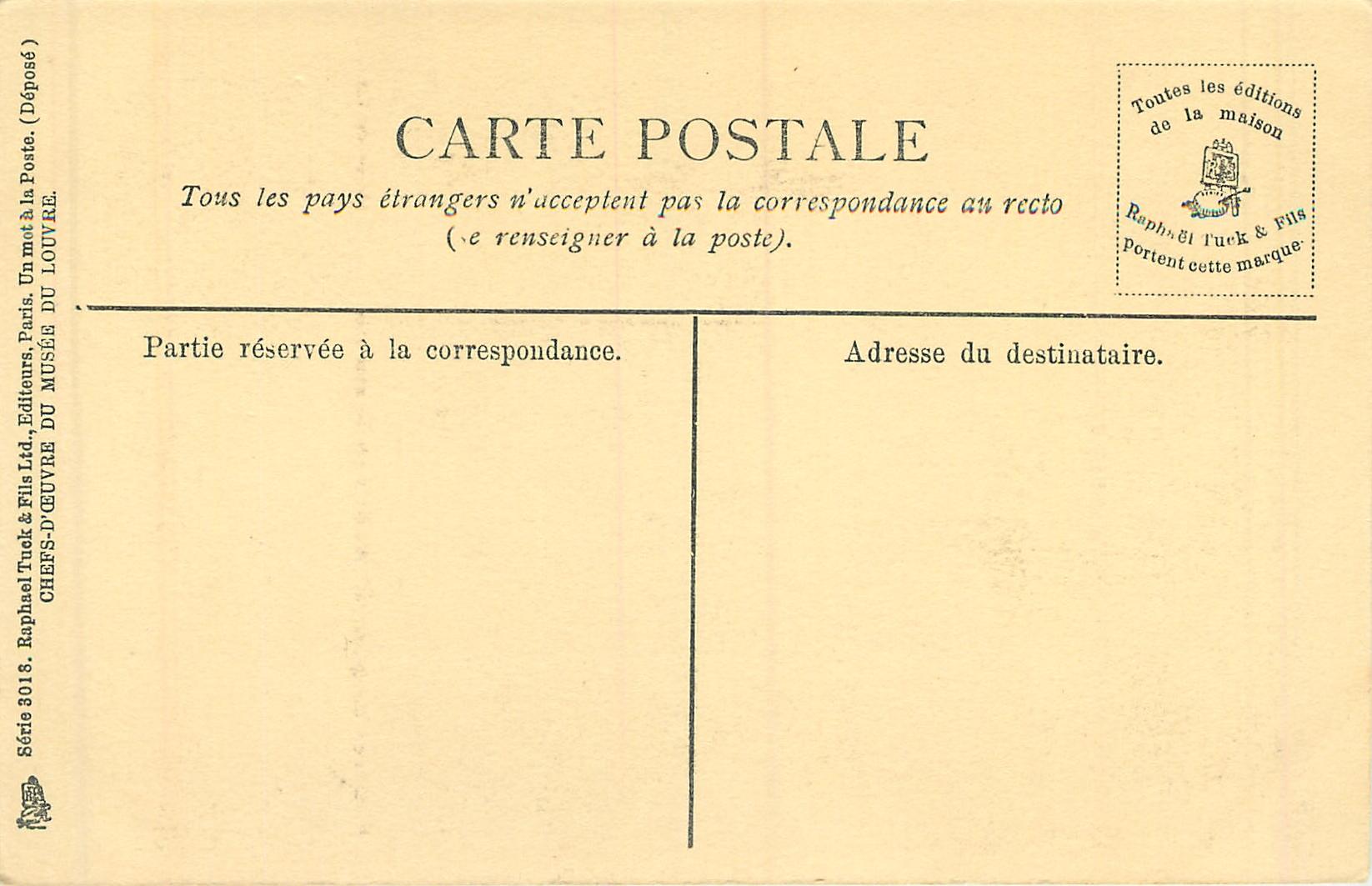 brown/purple,UN MOT A LA POSTE, (DEPOSE), same image & number, German/International back 3018 COLLECTION ALTER MEISTER AUS DEN FRANZOSISCHEN GALERIEN with inscription,front title & artist in French