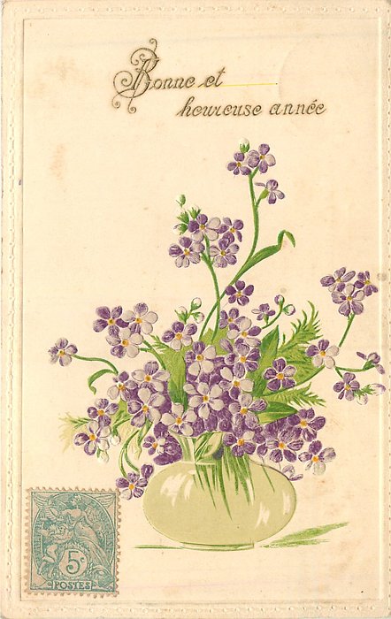 BONNE ET HEUREUSE purple flowers in green vase