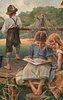 NACHBARSKINDER two girls read picture book on dock, one boy fishes behind facing away