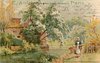 girl walks forward with milking stool & pail, cottage and water left