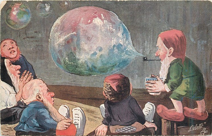 four dwarves sit admiring soap bubble blown from pipe of another dwarf standing right
