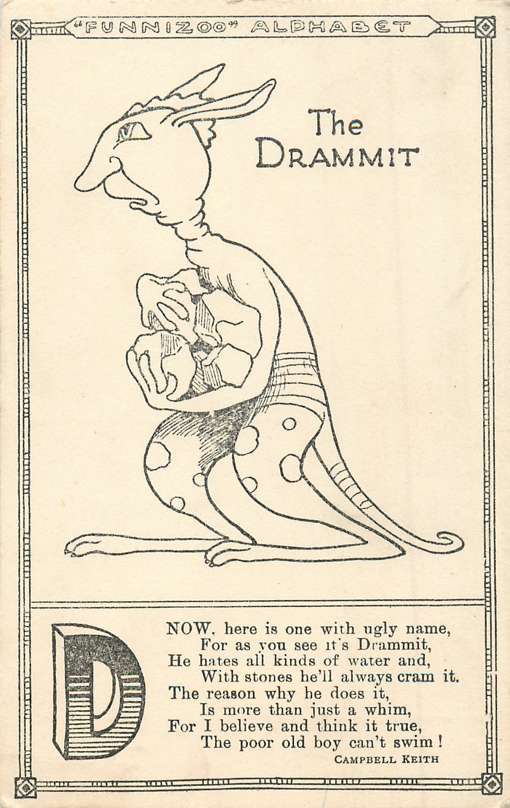 verse:- NOW HERE IS ONE WITH UGLY NAME, FOR AS YOU SEE IT'S DRAMMIT, HE HATES ALL KINDS OF WATER AND WITH STONES HE'LL ALWAYS CRAM IT. THE REASON WHY HE DOES IT, IS MORE THAN JUST A WHIM, FOR I BELIEVE AND THINK IT'S TRUE, THE POOR OLD BOY CAN'T SWIM!! quote CAMPBELL KEITH