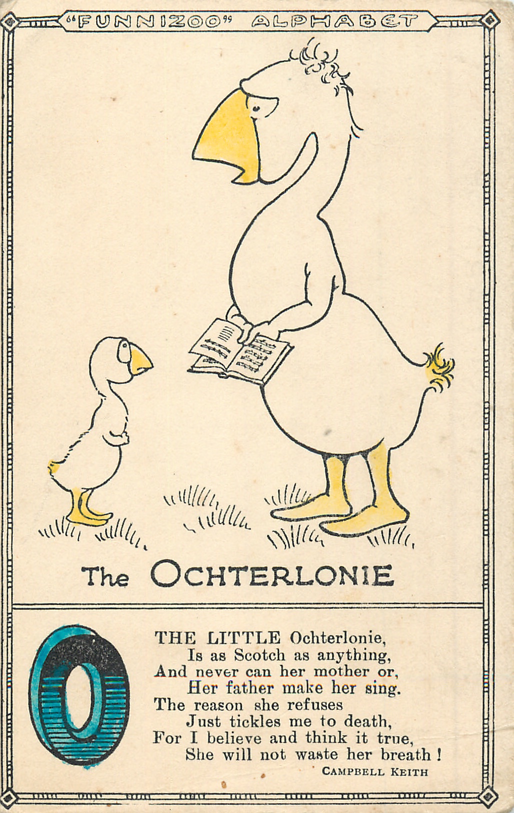 verse:- THE LITTLE OCHTERLONIE, IS AS SCOTCH AS ANYTHING, AND NEVER CAN HER MOTHER OR, HER FATHER MAKE HER SING. THE REASON SHE REFUSES JUST TICKLES ME TO DEATH, FOR I BELIEVE AND THINK IT TRUE, SHE WILL NOT WASTE HER BREATH! quote CAMPBELL KEITH