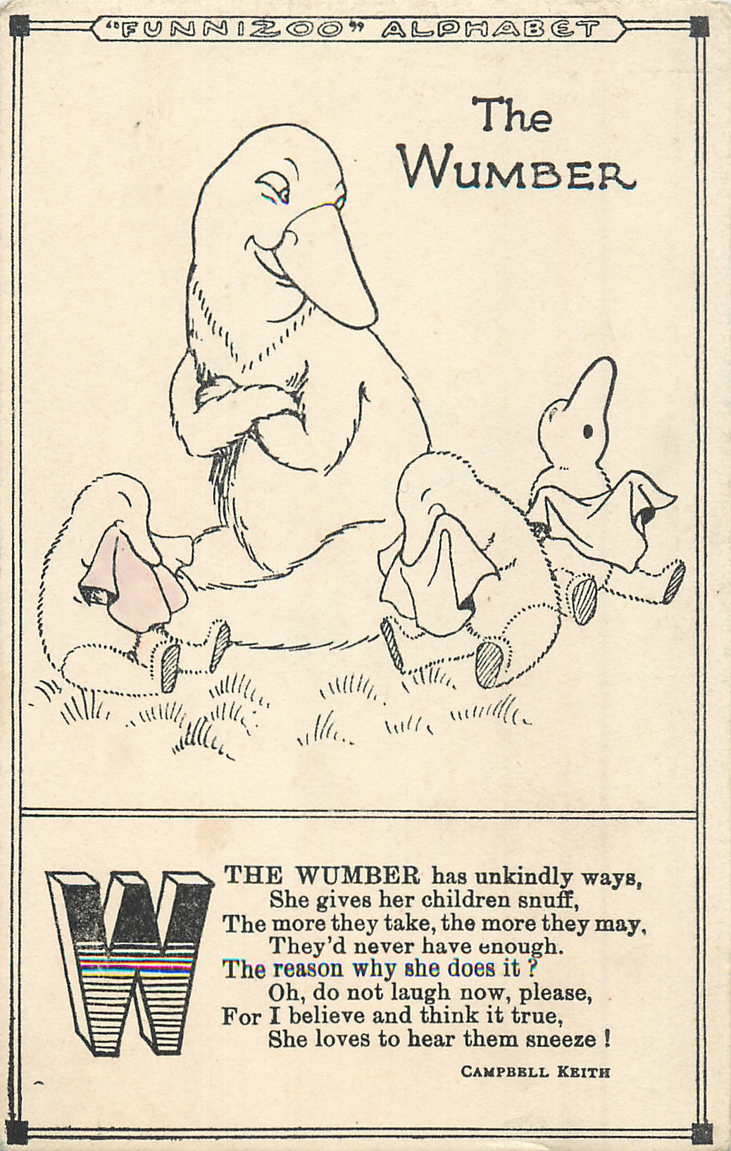 verse:- THE WUMBLER HAS UNKINDLY WAYS, SHE GIVES HER CHILDREN SNUFF, THE MORE THEY TAKE, THE MORE THEY MAY, THEY'D NEVER HAVE ENOUGH. THE REASON WHY SHE DOES IT? OH, DO NOT LAUGH, NOW, PLEASE, FOR I BELIEVE AND THINK IT TRUE, SHE LOVES TO HEAR THEM SNEEZE! quote CAMPBELL KEITH
