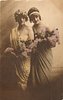 two pretty girls standing side by side with arms full of lilac, both girls face forward, right girl's head is slightly tilted