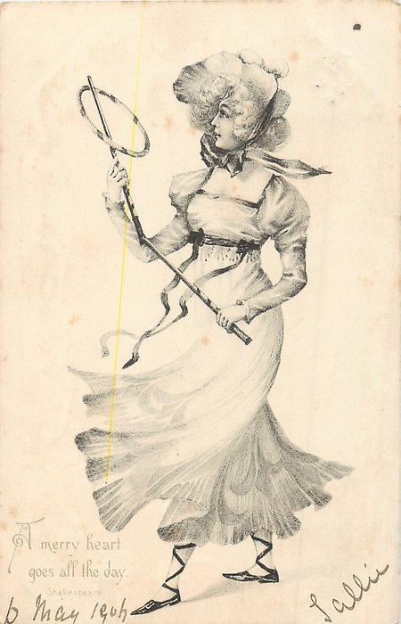 A MERRY HEART GOES ALL THE DAY girl holds broken stick & hoop, facing left