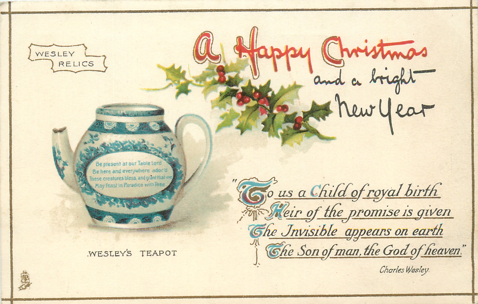 verse:- "TO US A CHILD OF ROYAL BIRTH HEIR OF THE PROMISE IS GIVEN THE INVISIBLE APPEARS ON EARTH THE SON OF MAN, THE GOD OF HEAVEN." quote CHARLES WESLEY, WESLEY'S TEAPOT same image & inscriptions C5005