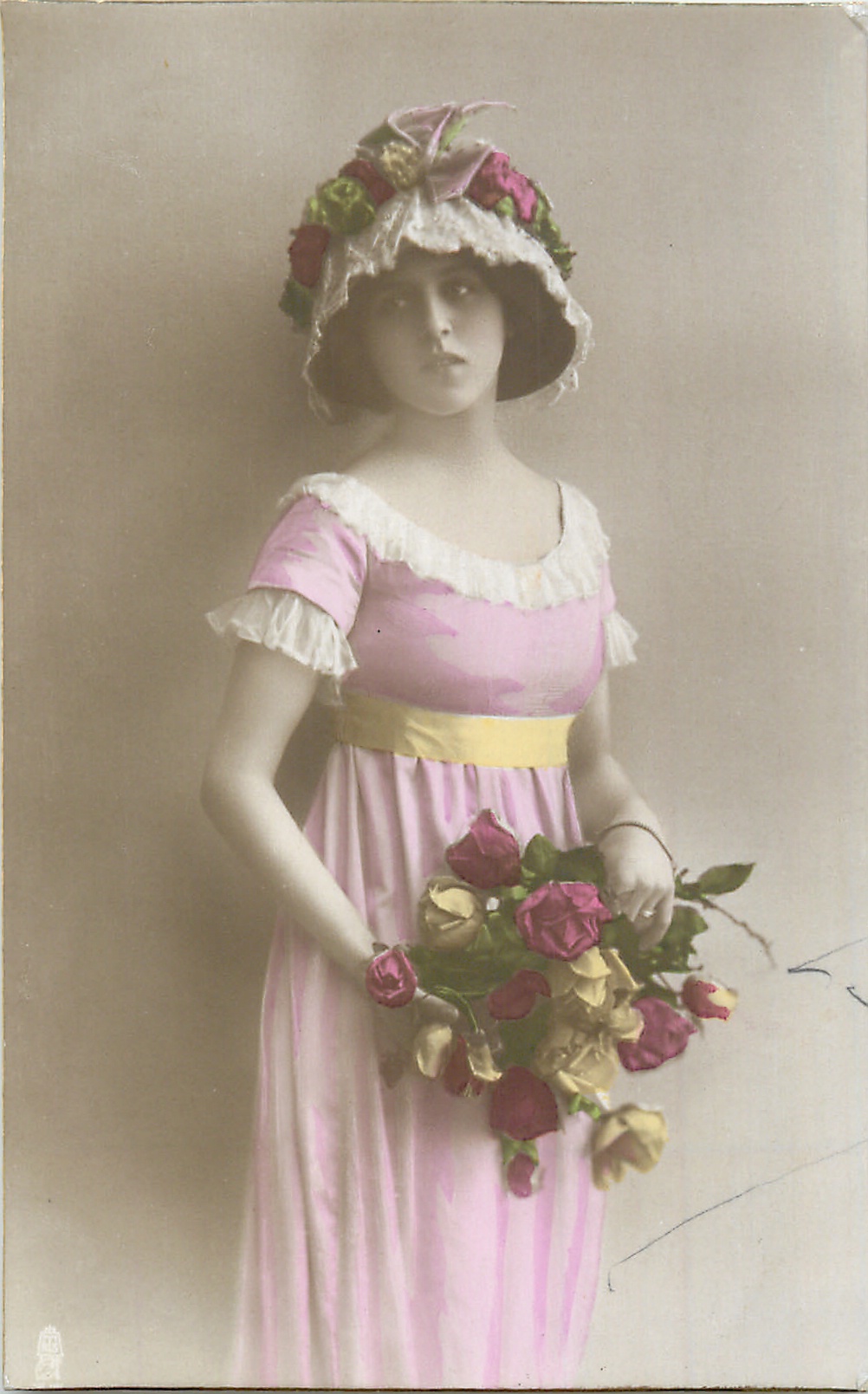 girl with boquet of roses held low with both hands, faces half right, looks front