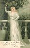 lady in flowing white dress stands on balcony holding up bunch of flowers in her right hand, green background