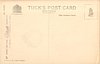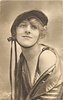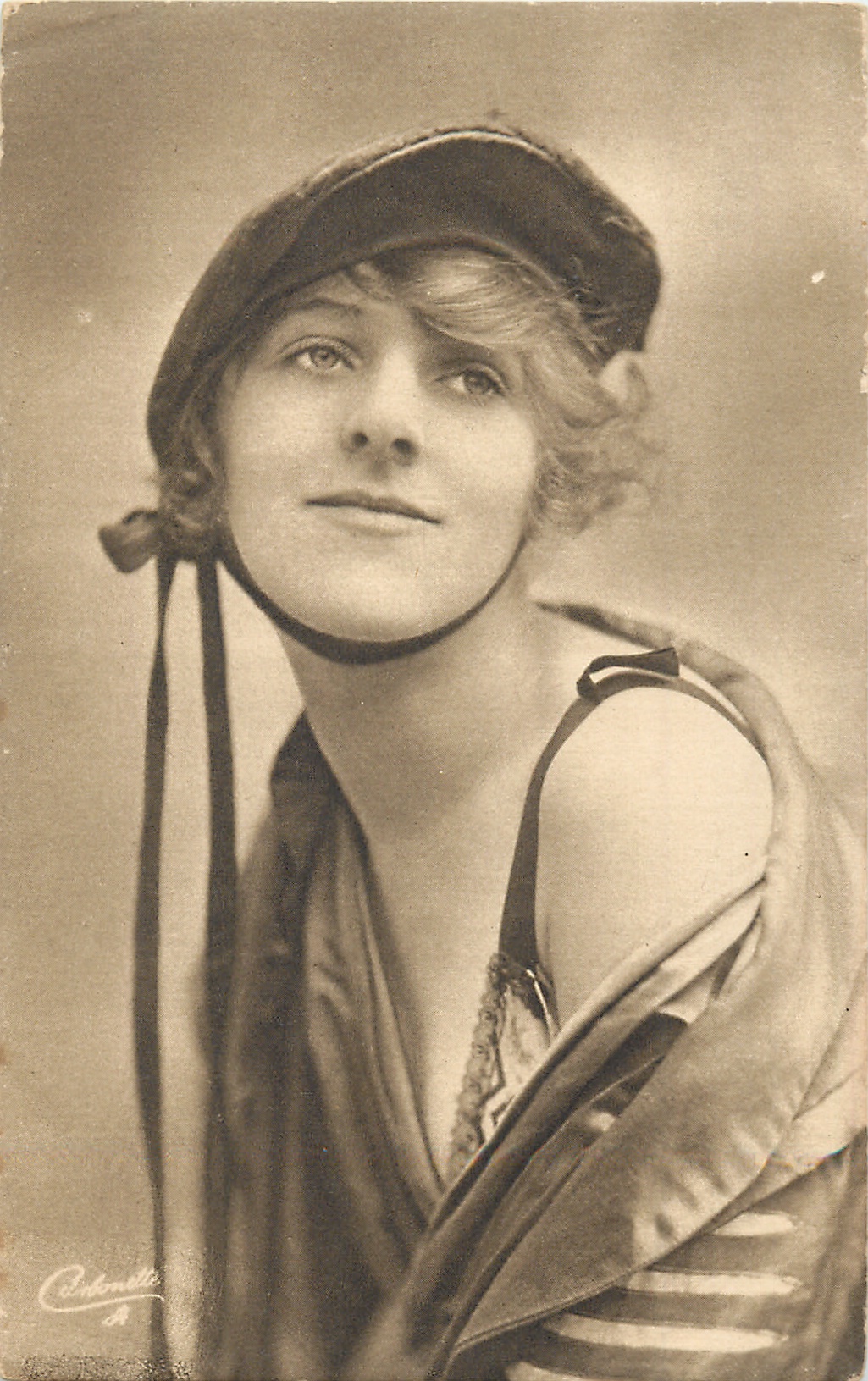 head & shoulders of woman wearing cap secured by ribbons round neck, faces left, looking front & up