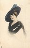 almost half-length study of dark haired girl with small blue ostrich feather hat, fur drape, facing partly left, looking front