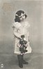 girl in white coat stands facing slightly right looking front holding bunch of flowers & evergreen