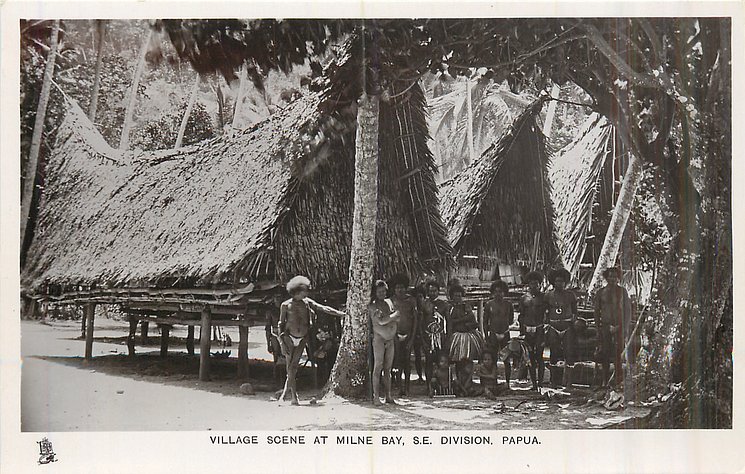VILLAGE SCENE AT MILNE BAY, S.E. DIVISION, PAPUA eight people standing in front of huts