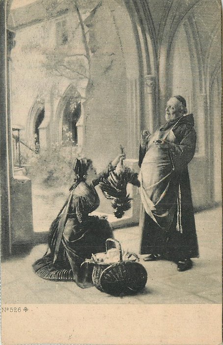 fat monk accepts dead chicken from pretty girl seated left