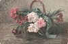 two white, one red, three carmine, one pink in wicker basket, handle visible