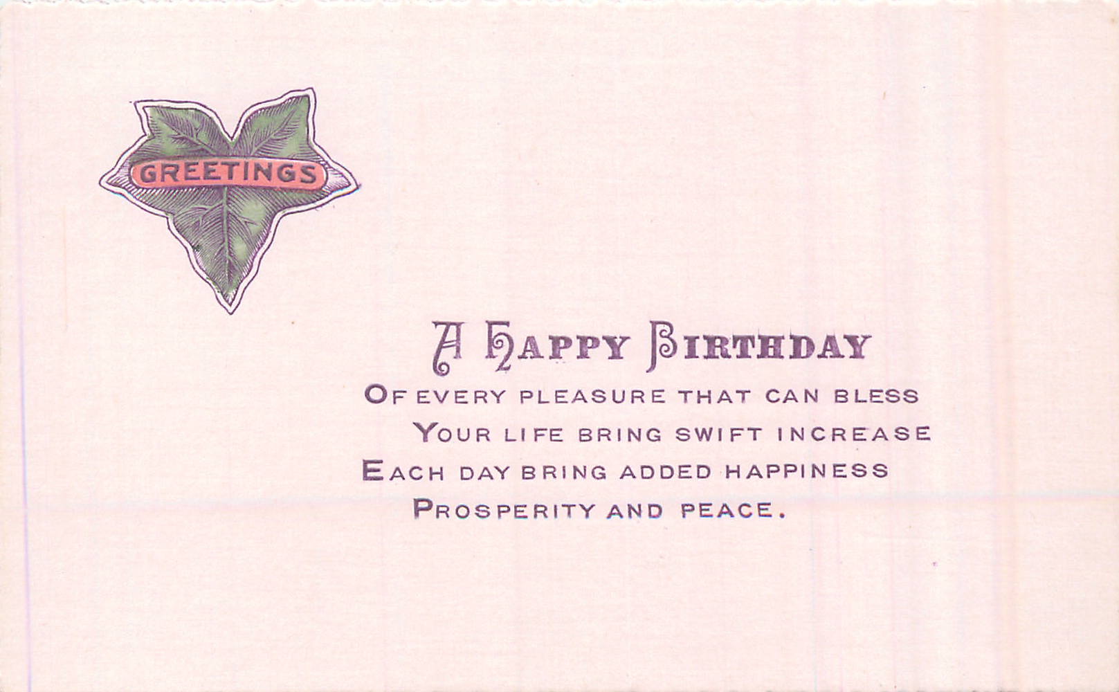 A HAPPY BIRTHDAY -- GREETINGS on ivy leaf upper left