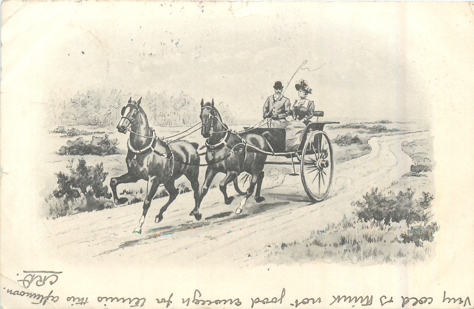 man with lady beside him, drives horse and trap front left