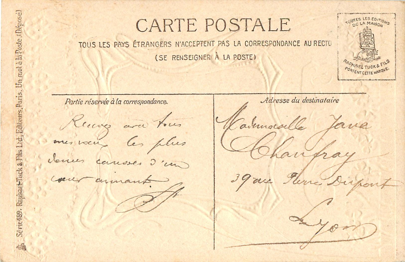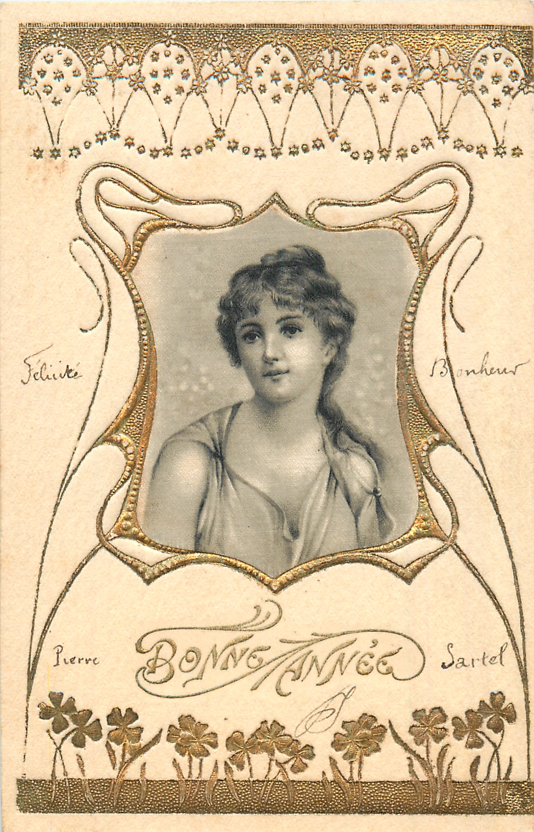 gilt embossed elaborate nouveau gilt decoration around irregular silk insets, UN MOT A LA POSTE, (DEPOSE)